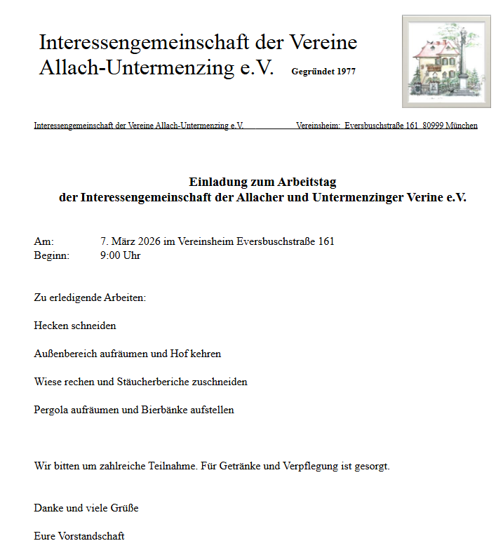 Einladung zur Mithilfe beim Arbeitstag der Interessengemeinschaft der Allacher und Untermenzinger Vereine e.V. am 7. März 2026, 9:00 Uhr im Vereinsheim, Eversbuschstraße 161